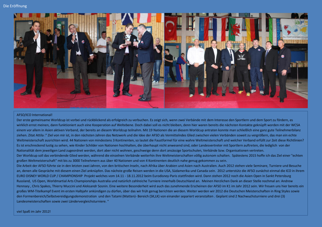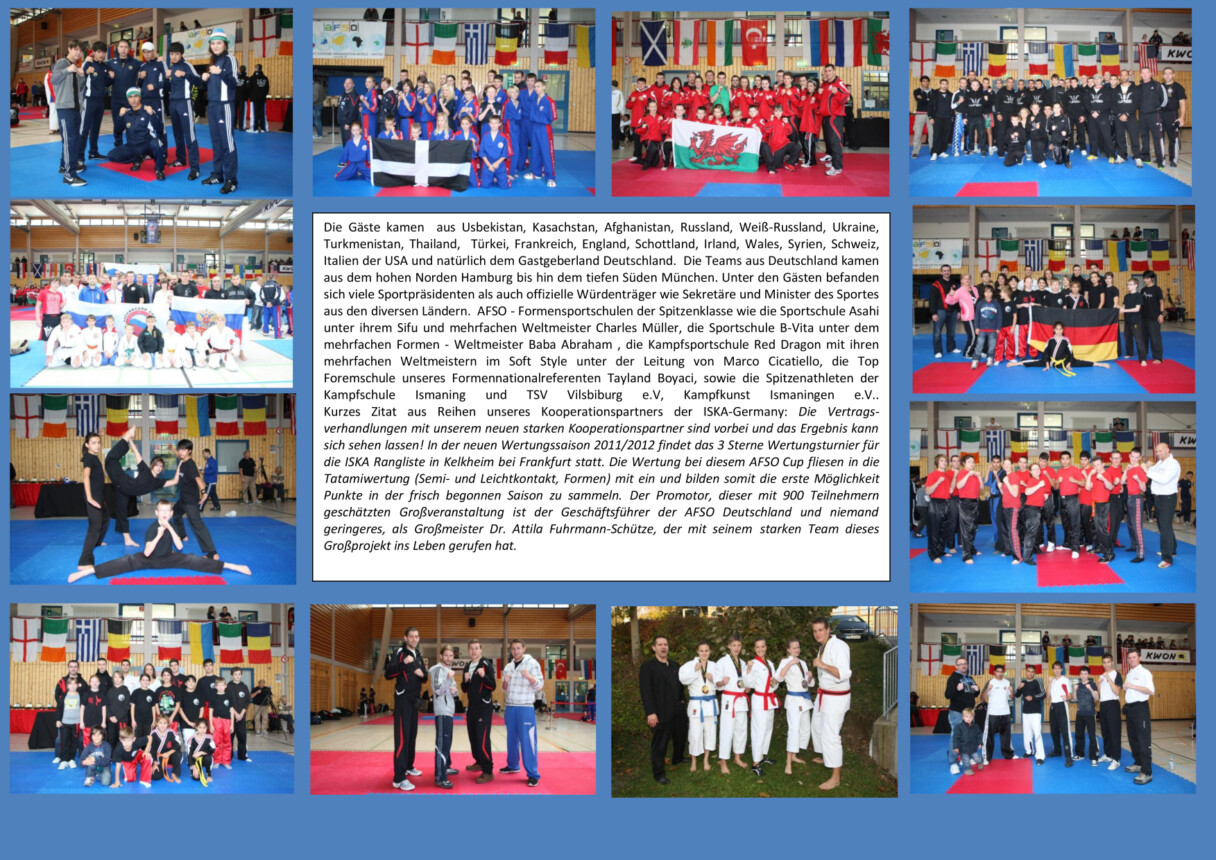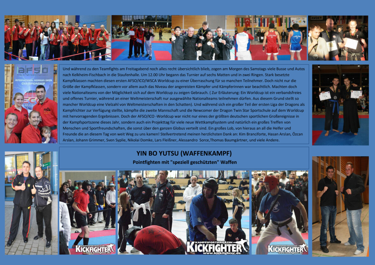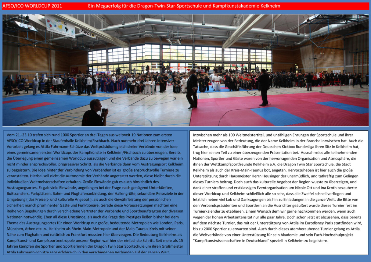 Für die Gastgeber aus Kelkheim den Wettkampfsportfreunden Kelkheim, dem AFSO Bundesleistungszentrum Dragon Twin Star, der Yin Do Yutsu Akademie der Kampfkunstwissenschaften Attila Fuhrmann-Schütze sowie dem Timeout , war die Entscheidung nach Kelkheim 2008 Athen ; 2010 Kelkheim ; Paris 2012; Madrid 2014 nun wieder Veranstaltungsort sein zu dürfen eine große Ehre und eine ganz besondere Gelegenheit für alle Sportler der Dragon Twin Star Sportschule Kelkheim, den oft müssen viele hoch talentierte Sportlerinnen und Sportler aus Kelkheim trotz Kader-Nominierung zu Hause bleiben, da die Kosten für eine WM Teilnahme einfach zu hoch sind. Doch bei einer Weltmeisterschaft und einem Worldcup vor der eigenen Tür mussten diesmal nur diejenigen passen, die gesundheitlich oder beruflich verhindert waren. So traten 20 Dragon Twin Star Sportlerinnen an den Weltmeisterschaften und 22 Dragon Twin Star Sportlerinnen am Worldcup in den verschiedenen Disziplinen an. Ein wahrer Medaillenregen erfuhren die Sportlerinnen und Sportler um Ihren Meister, Lehrer und Trainer Attila Fuhrmann-Schütze an diesem Wochenende! Zitat Attila“ Noch nie waren so viele meiner Schülerinnen und Schüler an einer WM bzw. WC angetreten und haben mich mit so viel Stolz erfüllt. Ich habe mich so sehr gefreut das endlich auch diejenigen denen sonst die finanziellen Mittel fehlen zeigen konnten was in Ihnen steckt.