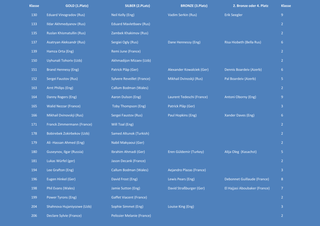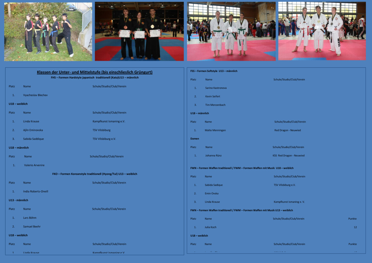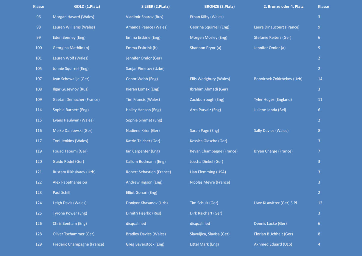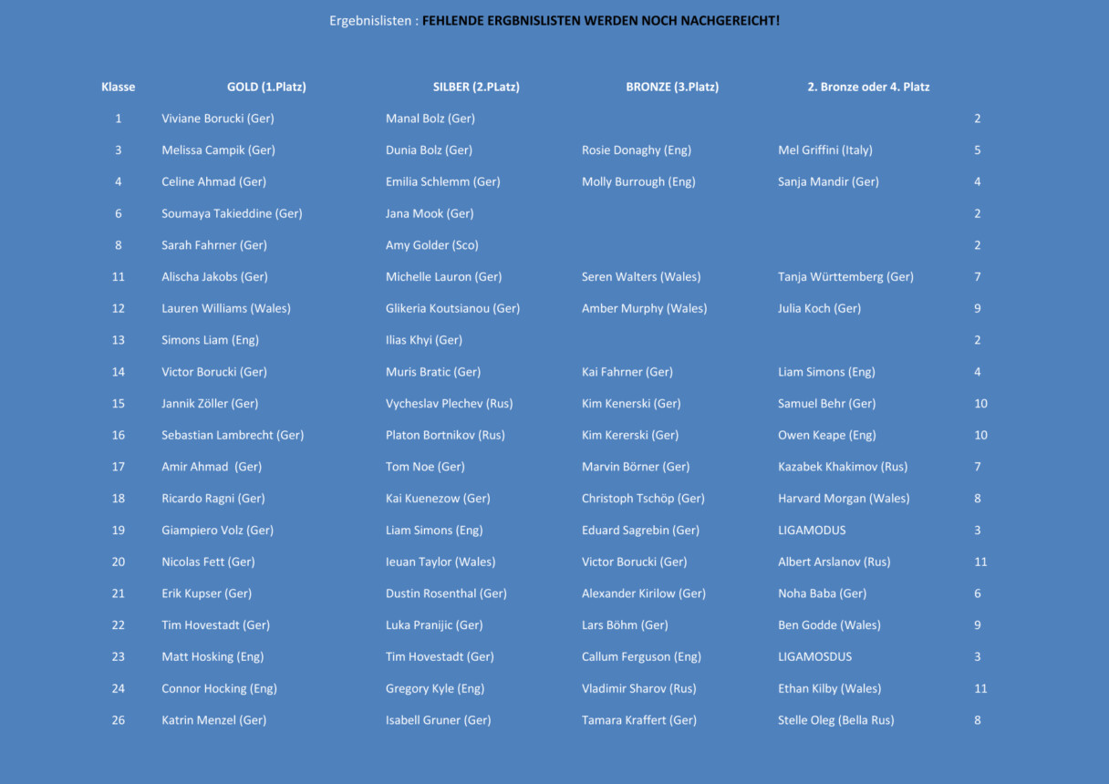Großes Lob an Anna Lindell (Gold); Lars Fleissner (2 X Gold); Michel Haase (Gold) , Faouzi Zaimi (Gold), Mohamed Halli (Silber), Judith Kahle (Silber), Day Ungehuer (Silber), Jil Junker (Silber), Fabian Schmidt (Silber), Dennis Bauer (Silber), Christopher Füssel (2 x Bronze); Janet Bär (Bronze), Alexander Henlein (Platz 4); Lotte (Platz 4)