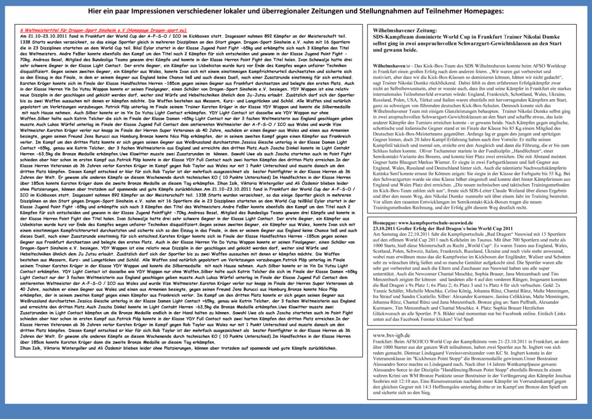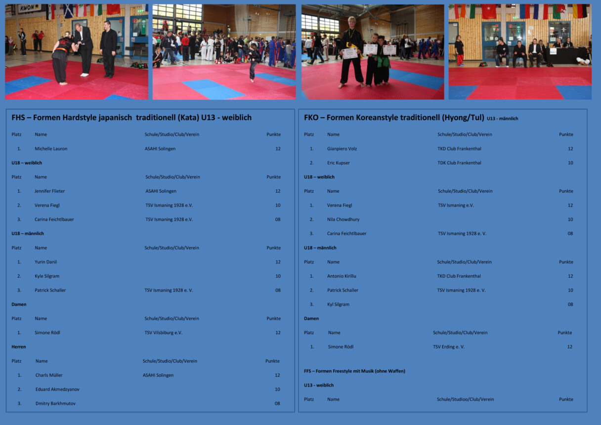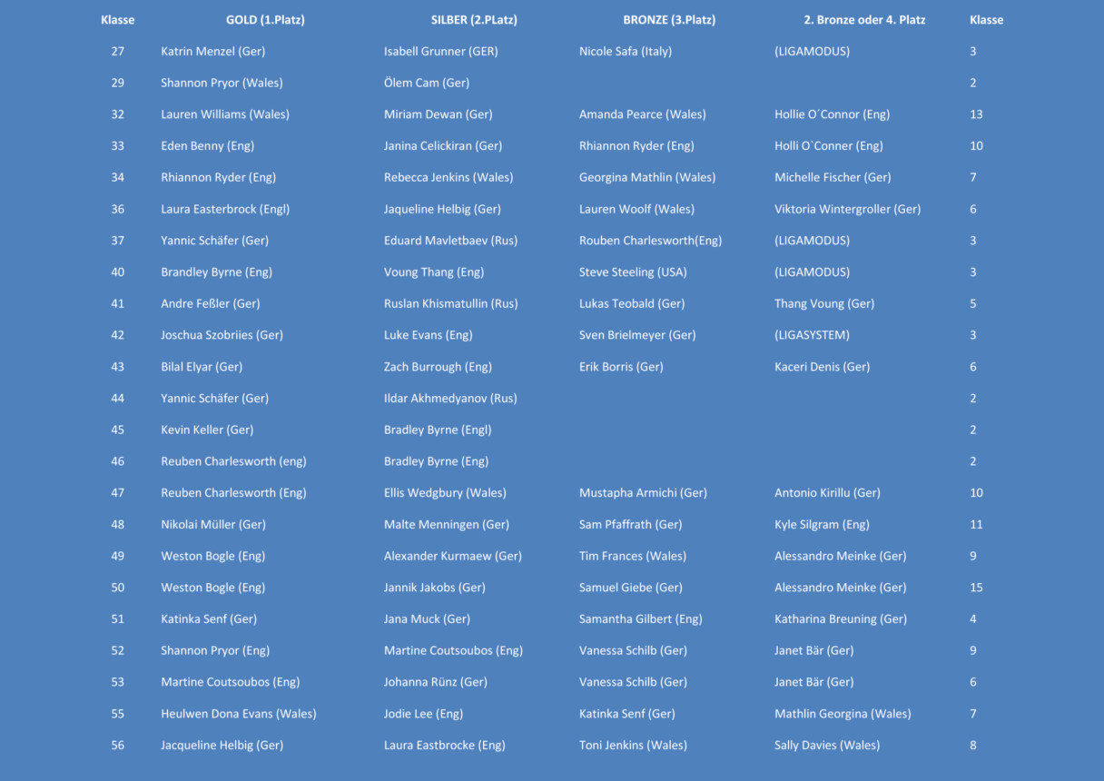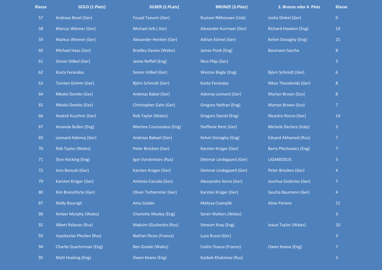 Großes Lob an Anna Lindell (Gold); Lars Fleissner (2 X Gold); Michel Haase (Gold) , Faouzi Zaimi (Gold), Mohamed Halli (Silber), Judith Kahle (Silber), Day Ungehuer (Silber), Jil Junker (Silber), Fabian Schmidt (Silber), Dennis Bauer (Silber), Christopher Füssel (2 x Bronze); Janet Bär (Bronze), Alexander Henlein (Platz 4); Lotte (Platz 4)