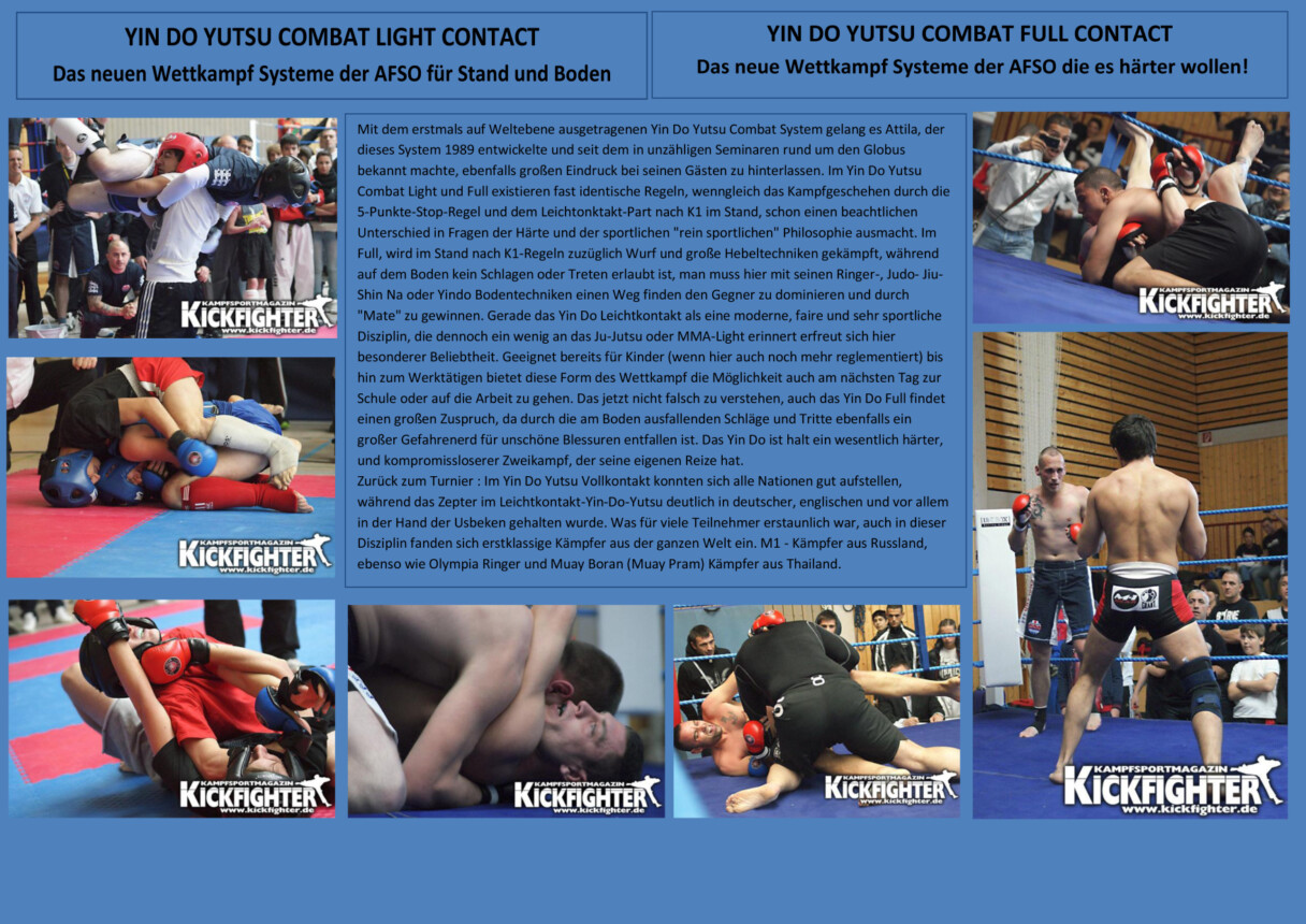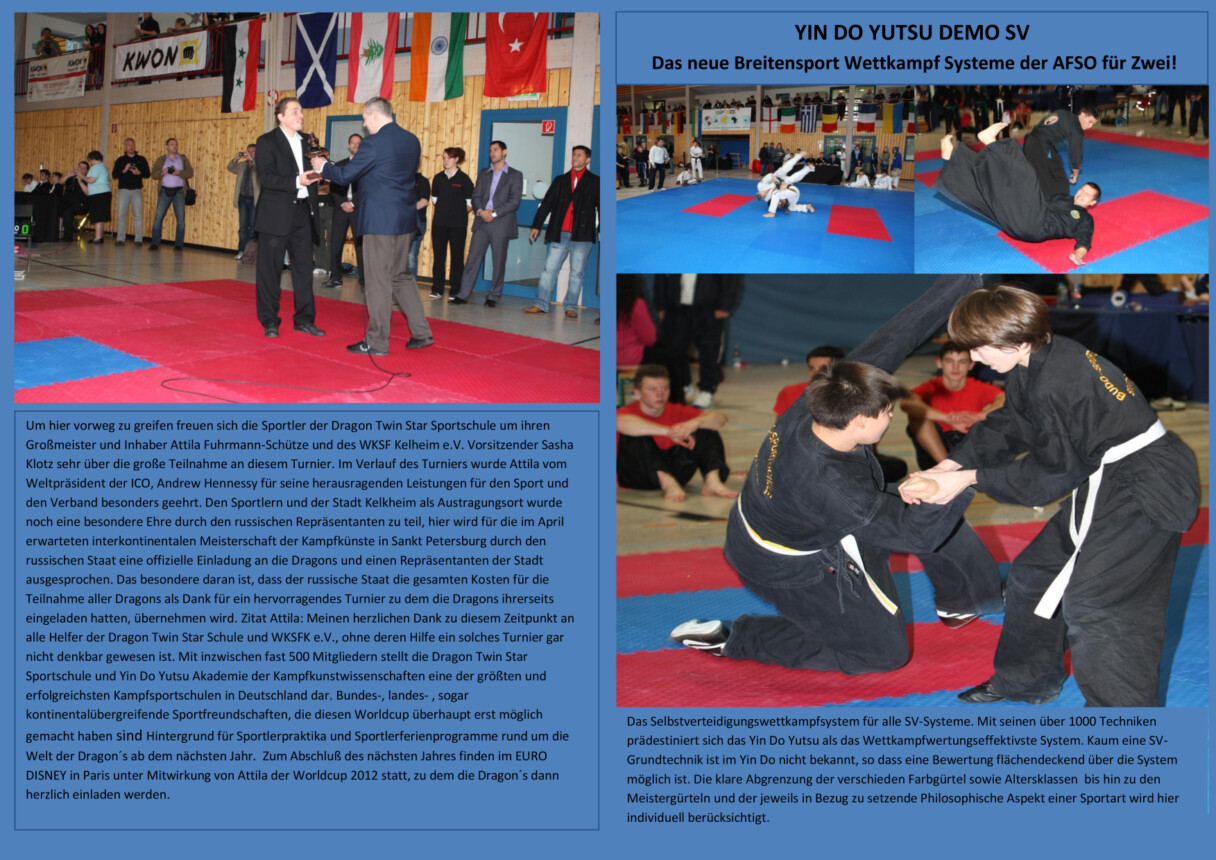 Bereits diesen Monat ( einer Einladung des asiatischen Selbstverteidigungsverbandes folgend ) am 17.07-22.07 stellt sich das Yin Do Yutsu Team von Dr. Attila Fuhrmann-Schütze den Herausforderungen der Vollkontakt-Selbstverteidigungsweltmeisterschaften, an denen fast alle asiatischen SV-Systeme auf Kish-Island teilnehmen. Hier kämpfen bis zu 5.000 Teilnehmer um die Titel in lediglich 7 Gewichtsklassen. Ein Turnier, das den Rahmen aller europäischen Vorstellungen sprengt.